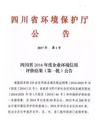7月21日,四川省環(huán)境保護(hù)廳發(fā)布2017年第1號(hào)公告,公布了2016年度第一批企業(yè)環(huán)境信用評(píng)價(jià)結(jié)果。在全省申報(bào)的851家企業(yè)中,包括四川東材科技集團(tuán)股份有限公司在內(nèi)的29家企業(yè)獲得四川省2016年度“環(huán)境誠(chéng)信企業(yè)”稱號(hào)。 據(jù)環(huán)保廳政策法規(guī)處介紹,“環(huán)保誠(chéng)信企業(yè)”的評(píng)...